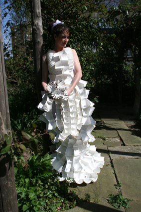 A current design project has introduced me to an unusual yet fun and exciting Upcycling process of making fashion/art pieces from industrial waste. The Bridal Cupture dress you see here has been made from around 200 Huhtamaki Bioware cups to be displayed at the Footprint Awards next month. More garments will be constructed - I will update in the run up to the event. I am collaborating with Zoe Fletcher for the awards project and we are both making garments for the awards exhibit.